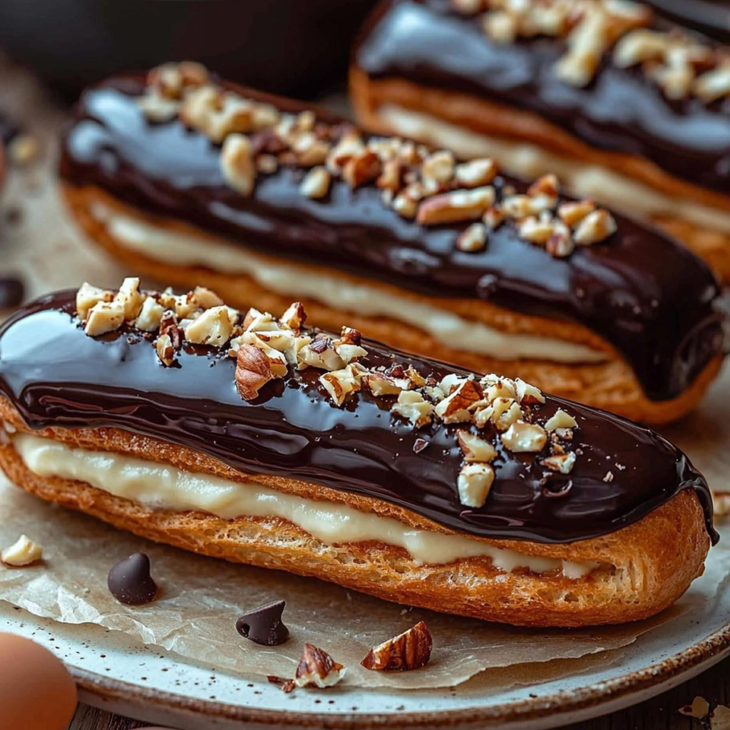 - Éclairs – Light choux pastry filled with flavored cream or custard and topped with a glossy icing.